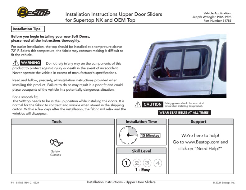 It's cold outside, you're at the toll booth ready to throw change into the hopper and the struggle begins to unzip that vinyl window. And then you have to try and zip it up while pulling out or risk the wrath of horn-honkers behind you. Stop struggling and start using Bestop Upper Door Sliders. You can just slide a glass panel open, do your thing and then just as quickly, slide it shut. This is the perfect accessory for 1988-1995 Wrangler soft top owners with fabric upper doors. This is one of our best-selling cold weather products.