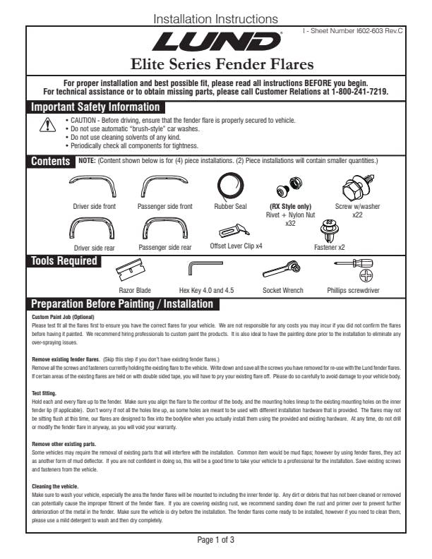 Lund RX-Rivet Style Fender Flares add style, protection and performance. Fender flares come in a variety of styles, from low-profile to big and bold featuring a textured or smooth paint-ready finish. The Elite Series Fender Flares are made with Tri-Flex ABS thermoplastic material to allow for maximum durability. This provides a dense, hard and scratch-resistant surface, flexible enough to bend without breaking.