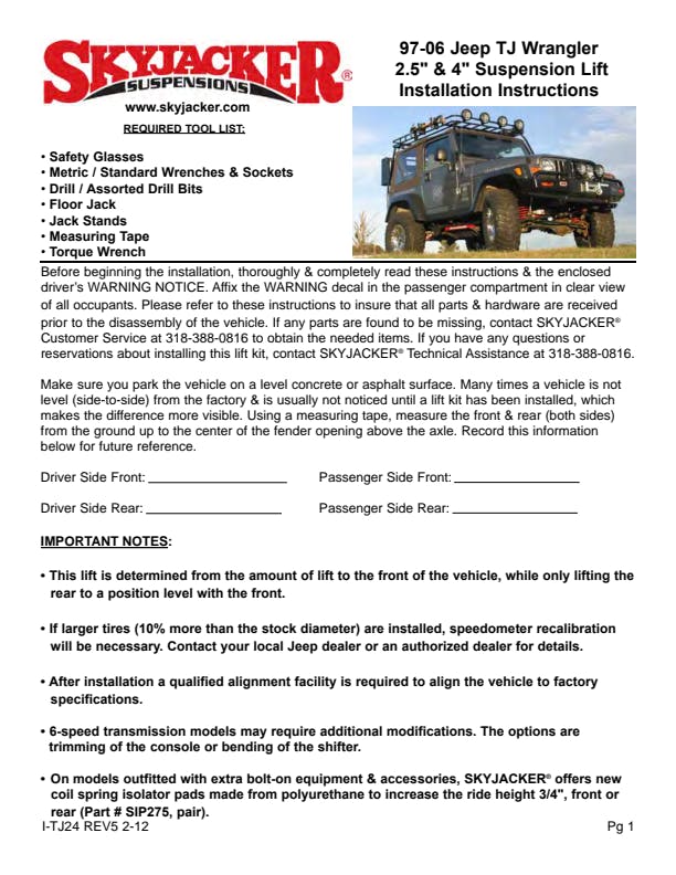 On the Wrangler TJ, coil springs and shocks are primary determining factors in ride quality and suspension performance. Skyjacker 2-Stage Variable Rate Springs deliver a smooth controlled comfortable ride. First Flex Rate stage delivers a comfortable ride with the ability to flex/expand during full articulation as the suspension drops (full droop). This keeps the coil springs seated in the upper coil mount/bucket and the tires in contact with the terrain. Second Ride Rate stage only engages after compression past Flex Rate.Skyjacker ADX 2.0 Adventure Series Remote Reservoir Aluminum Monotube Shocks deliver modern technology in the design with an innovative off-road race-inspired full-displaced valving system. ADX 2.0 provides consistent dampening, high-end performance, cooler running, more control and improved driving comfort. From higher speeds to a highway crawl, ADX 2.0 work. The large 46mm bore size of the Monotube and remote reservoir reacts quicker and creates the smoothest ride possible. The external remote reservoir separates the nitrogen gas from the oil with an Internal Floating Piston (IFP). The majority of the reservoir contains pressurized nitrogen gas. The IFP prevents the gas and oil from mixing or foaming (cavitation). Nitrogen charged with IFP Technology = Quickest Shock Reaction Time Ever.Longer Replacement Front and Rear Lower Control Link Arms correct caster angle. Formed from 2-inch OD x 0.250 wall DOM tubing, both pairs of fixed length arms with pressed-in OEM style steel encased rubber bushings at the frame and the axle mounts. A tubular Transfer Case Lowering Kit helps avoid drive shaft vibration by correcting proper driveline angle while retaining as much ground clearance as possible. Transfer Case Linkage Relocation Bracket included. Front and Rear Bump Stop Spacers prevent over-compression. Rear Track Bar Lower Axle Mount Bracket corrects track bar angle to create better handling and a less side-to-side sway.