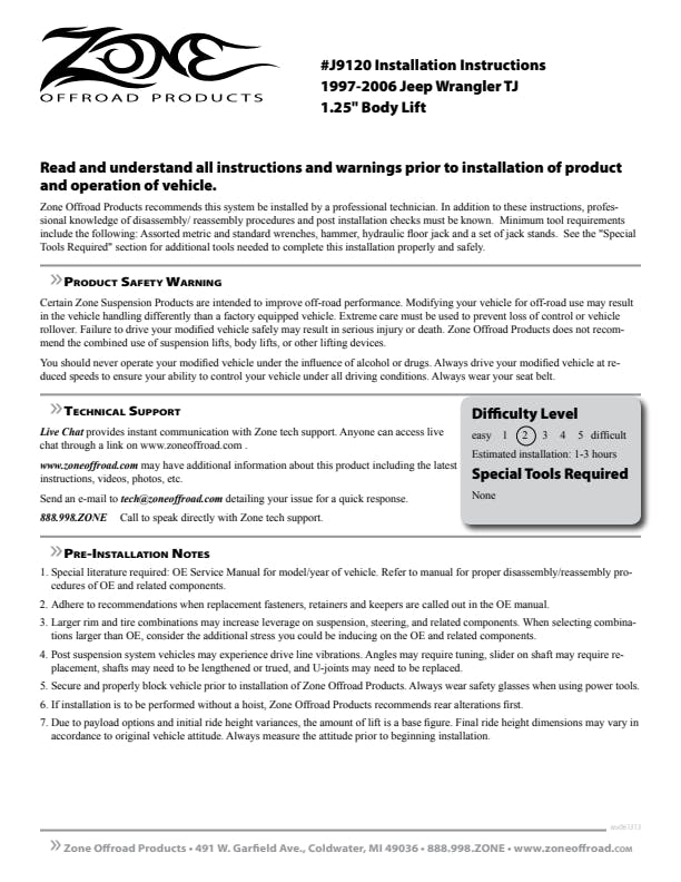 Get the clearance you’re looking for with this easy and economical 1.25 Body Lift Kit on your 1997 - 2006 Jeep Wrangler (TJ) . This lift won’t affect your center of gravity, spring rate or steering geometry, so you can fit the bigger tires and eliminate rubbing without any problems.